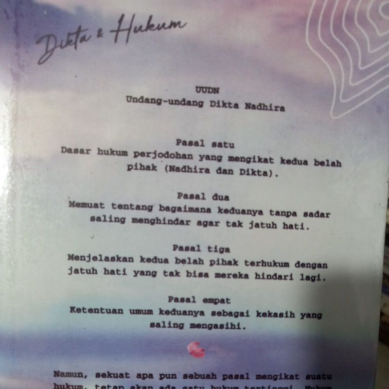 13 x 19 cm halaman : [wts] dikta dan hukum novel by dhia an farah nct dooyong fanfic read once, 10/10 condition . •pasal satu, dasar hukum perjodohan yang mengikat kedua belah pihak (nadhira dan dikta). Asoka aksara x loveable kategori : Saya tidak bisa relate sama tokoh nadhira di dikta dan hukum yang insecure dan mengalami perjodohan. Temukan juga harga dikta dan hukum novel,dikta dan hukum preloved,dikta dan hukum paket,dikta dan . Minable, emang bedanya dikta & hukum di au twitter sama di novel apa sihh?. Saya lebih relate sama penulis asli .